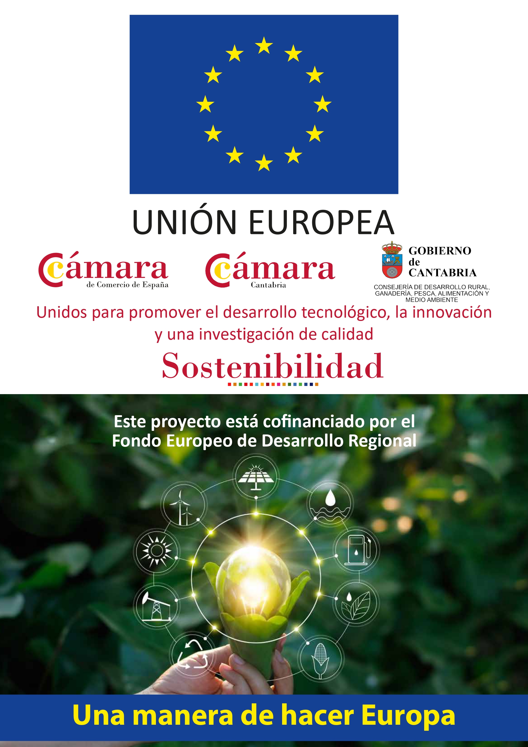 OMT RECYCLING PROJECT SL ha sido beneficiaria del Fondo Europeo de Desarrollo Regional cuyo objetivo es Potenciar la investigación, el desarrollo tecnológico y la innovación, y gracias al que ha conseguido el cálculo de su huella de carbono y asesoramiento en buenas prácticas medioambientales para apoyar la creación y consolidación de empresas innovadoras en el año 2022. Para ello ha contado con el apoyo del Programa Sostenibilidad de la Cámara de Comercio de Cantabria.